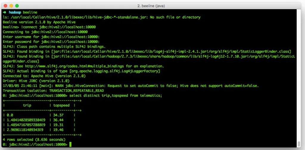 result.write.format("parquet").mode(SaveMode.Append).saveAsTable("telematics")Top and average speed are simple – group the result by trip, use avg(1) and max(1) and join the result with the original DataFrame on column “trip”. The result winds up in a Hive table called “telematics”.