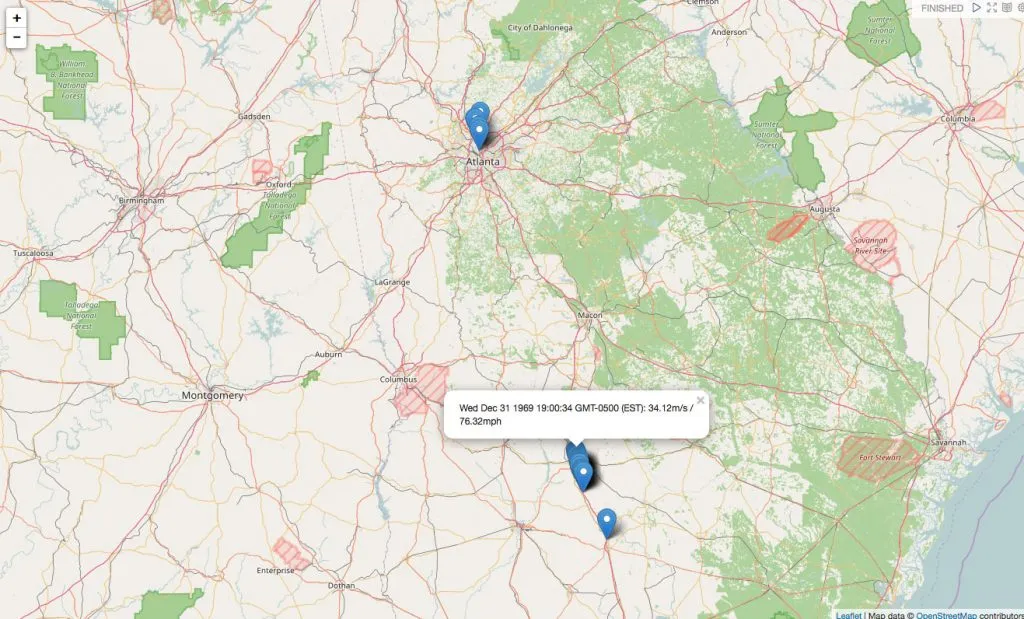 For the latter, we abstract the concept and define an absolute speed limit – for Georgia and Florida (where I collected my sample data), that would be 70mph (or 31.3m/s). In a real life scenario, you would want to think about matching the GPS location to a map provider that offers specific speed limits – because 70mph in a 30mph zone is not a good idea.