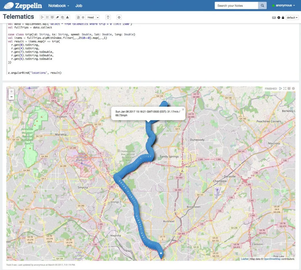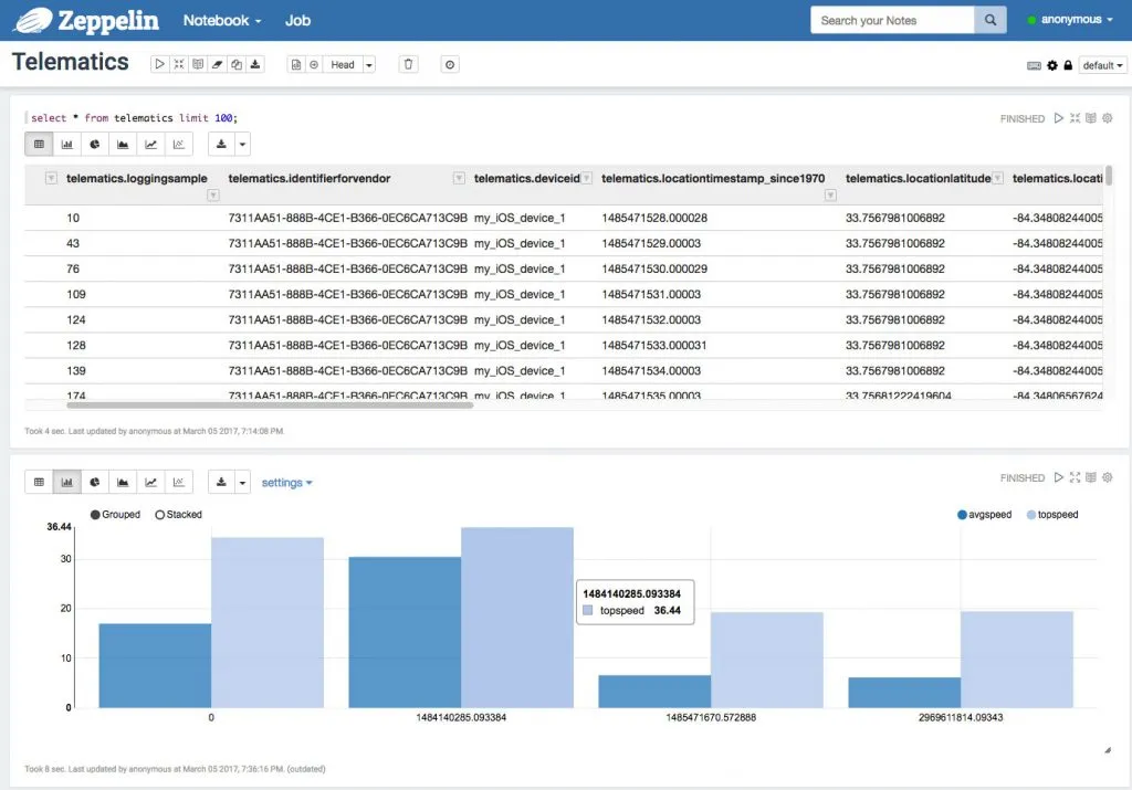 We can also use Zeppelin to analyze our data with any other form of SQL and visualization. For instance, this example, we took all trips currently in the system and plotted them against their top- and average speeds.