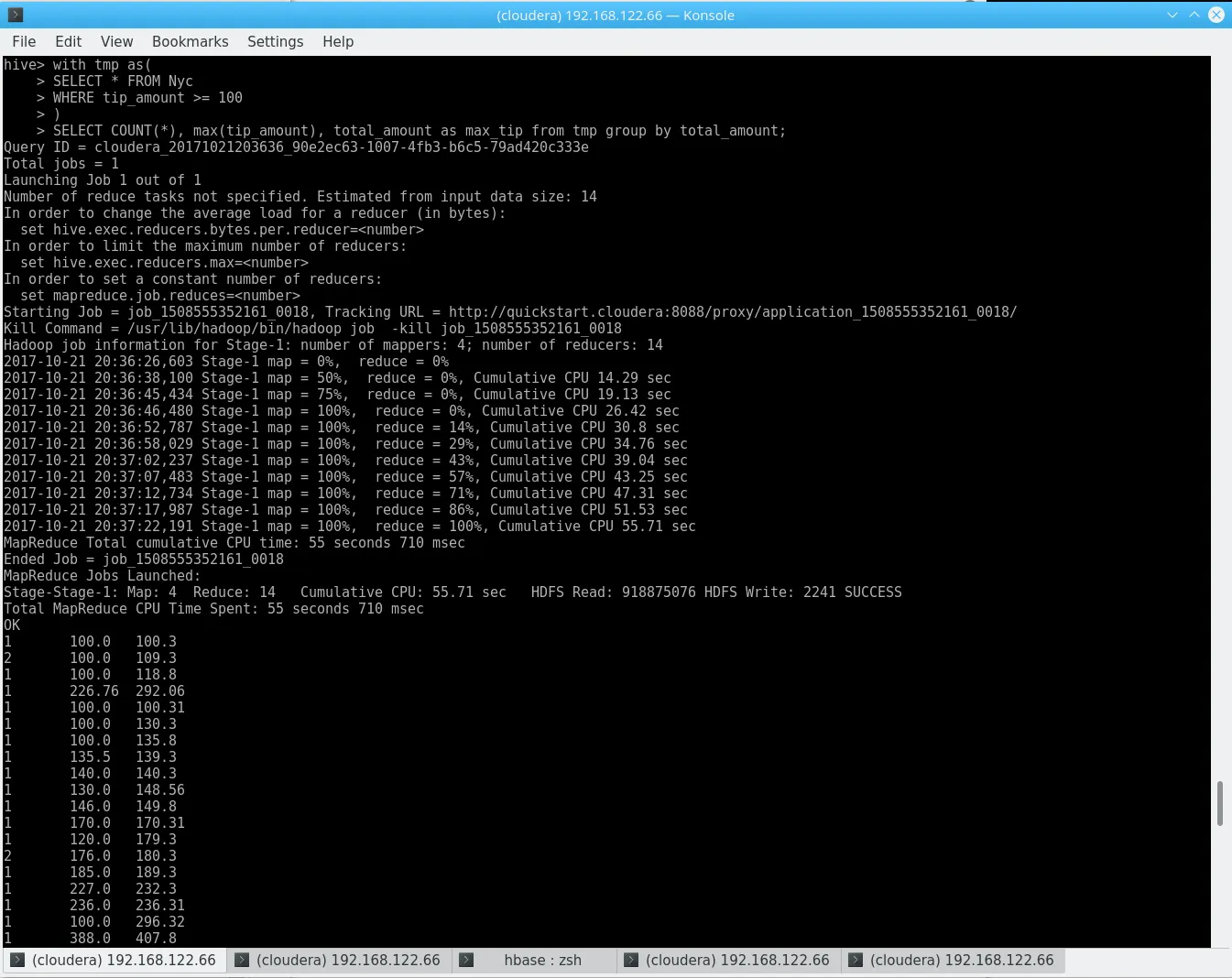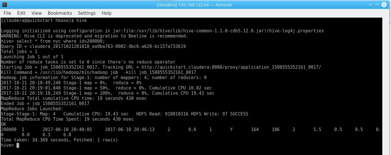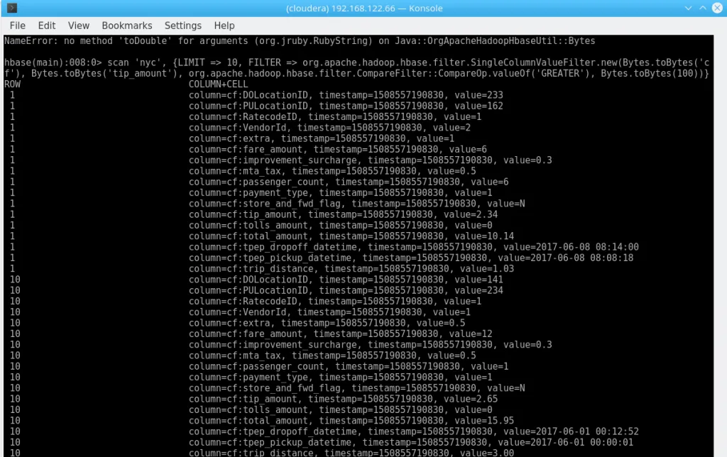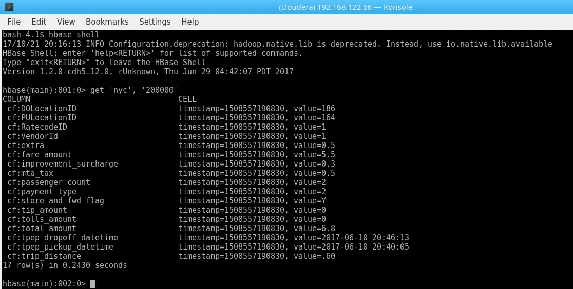 hbase shell <<< "create 'nyc', 'cf'"dos2unix yellow_tripdata_2017-06_id.csvhdfs dfs -copyFromLocal yellow_tripdata_2017-06_id.csv /user/clouderahbase org.apache.hadoop.hbase.mapreduce.ImportTsv -Dimporttsv.separator=, -Dimporttsv.columns="HBASE_ROW_KEY,cf:VendorId,cf:tpep_pickup_datetime,cf:tpep_dropoff_datetime,cf:passenger_count,cf:trip_distance,cf:RatecodeID,cf:store_and_fwd_flag,cf:PULocationID,cf:DOLocationID,cf:payment_type,cf:fare_amount,cf:extra,cf:mta_tax,cf:tip_amount,cf:tolls_amount,cf:improvement_surcharge,cf:total_amount" nyc /user/cloudera/yellow_tripdata_2017-06_id.csvOne might add that the initial import took plenty of time on the Quickstart Configuration, which, granted, is not very good. The command also exits with Bytes Written=0 if something is wrong (like a mismatch in the columns) – do not pass Go. Do not collect $200.