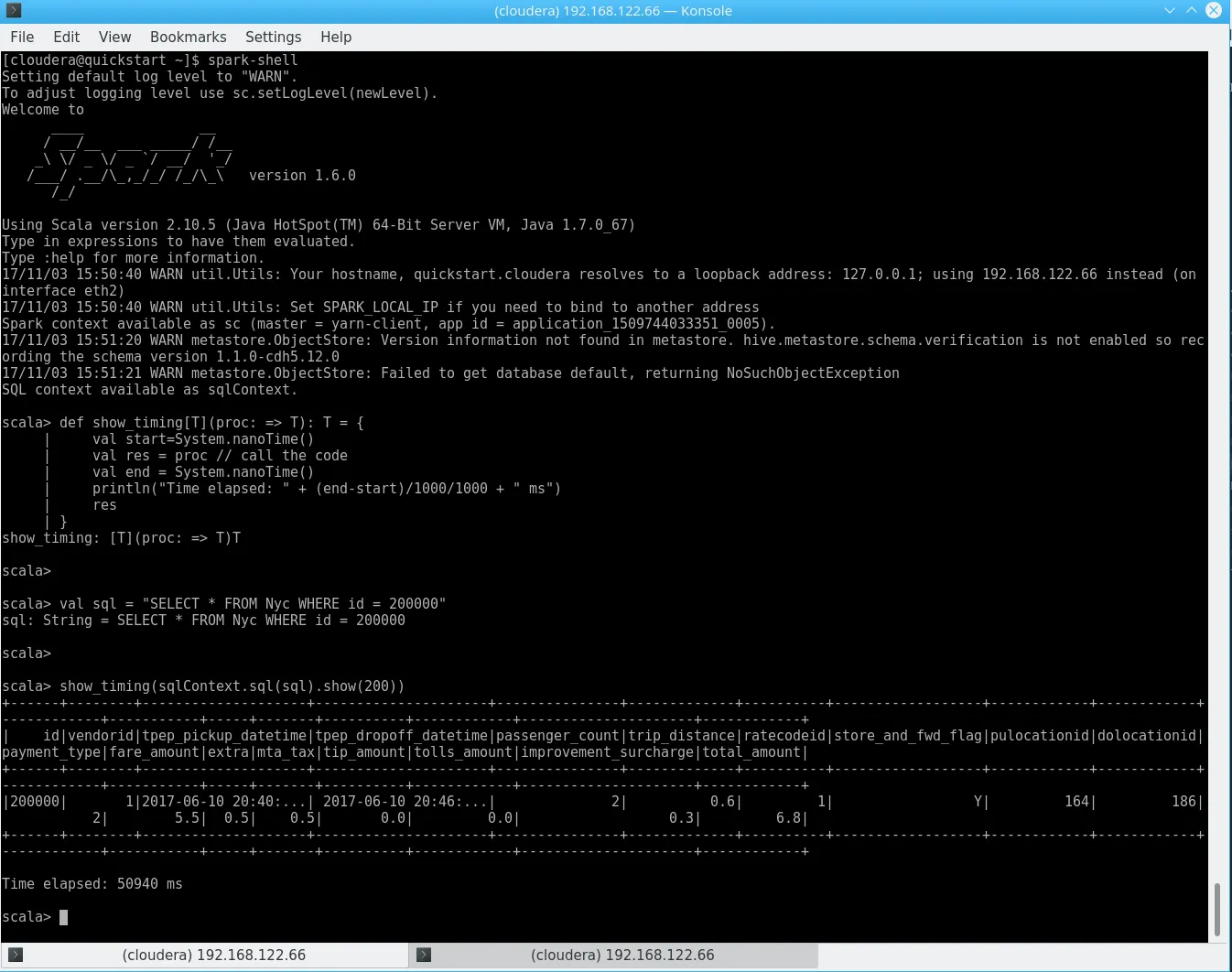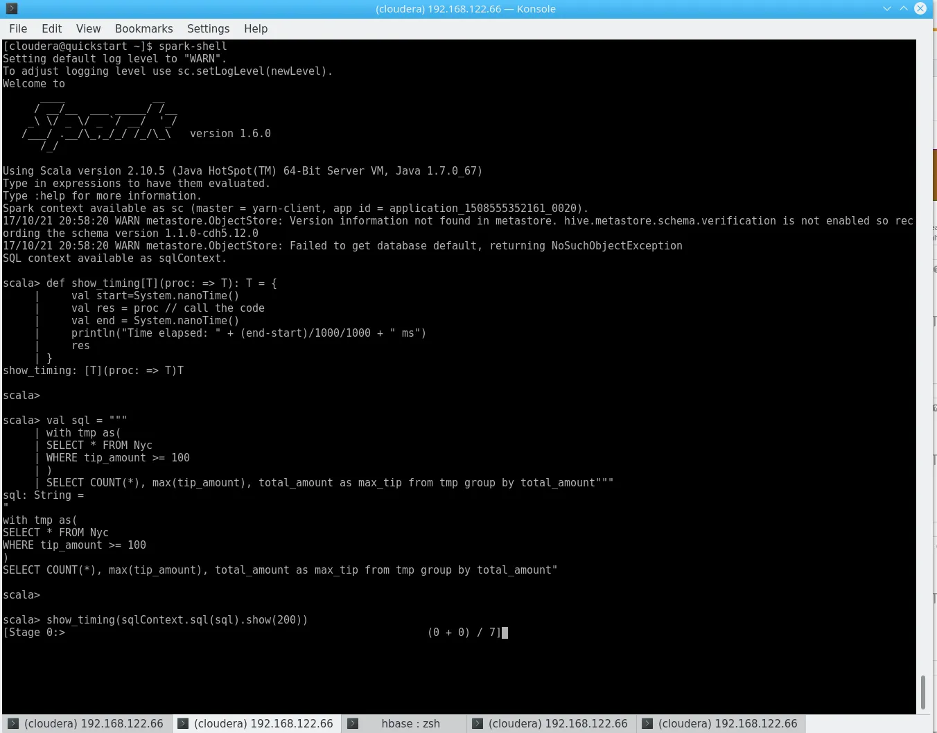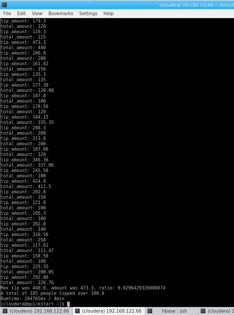 hbase shell <<< "create 'nyc', 'cf'"dos2unix yellow_tripdata_2017-06_id.csvhdfs dfs -copyFromLocal yellow_tripdata_2017-06_id.csv /user/clouderahbase org.apache.hadoop.hbase.mapreduce.ImportTsv -Dimporttsv.separator=, -Dimporttsv.columns="HBASE_ROW_KEY,cf:VendorId,cf:tpep_pickup_datetime,cf:tpep_dropoff_datetime,cf:passenger_count,cf:trip_distance,cf:RatecodeID,cf:store_and_fwd_flag,cf:PULocationID,cf:DOLocationID,cf:payment_type,cf:fare_amount,cf:extra,cf:mta_tax,cf:tip_amount,cf:tolls_amount,cf:improvement_surcharge,cf:total_amount" nyc /user/cloudera/yellow_tripdata_2017-06_id.csvOne might add that the initial import took plenty of time on the Quickstart Configuration, which, granted, is not very good. The command also exits with Bytes Written=0 if something is wrong (like a mismatch in the columns) – do not pass Go. Do not collect $200.