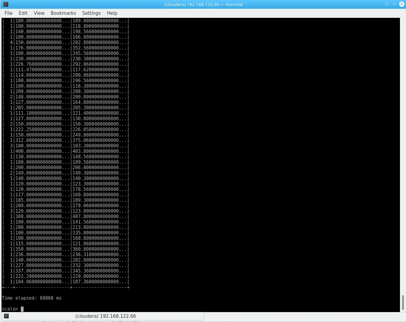 Time elapsed: 12420 ms12s for the exact same result. Of course – we already spent time on Hive prior to this, but the same result with a slightly different performance outcome could be achieved by reading the CSV from HDFS directly! Using Spark 2 makes this easy, but we can use the default 1.6 as well, as installing Spark 2 on Cloudera be a bit tricky.