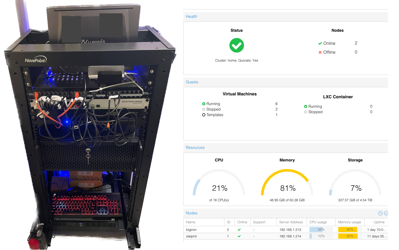 The other rather obvious change is the use of a Proxmox cluster (a fancy Hypervisor - more on that later), alongside a whole bunch of virtual machines, all doing a very specific thing: