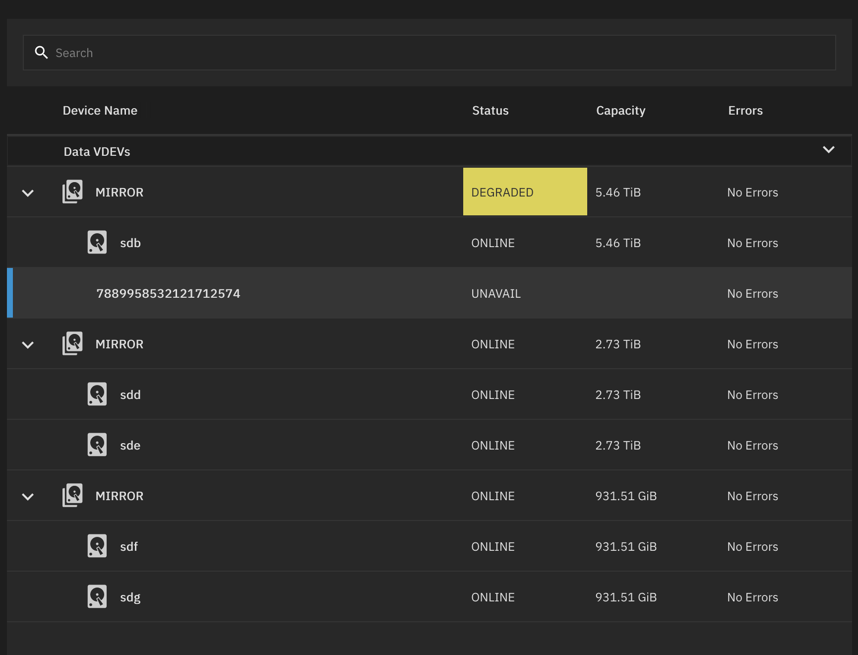 Previously, the pool referred to /dev/sdg (which is dumb in the first place - use /dev/disk/by-id …), so, uh, zfs add seemed like a good option to fix the degraded pool. ‘twas not. I should have replaced the disk - the easiest would have been to nuke it and have zfs re-replicate the data. Oh well. I wisely did that migration after all backups were done an redundant, so it was a matter of letting the restore run while I slept.
