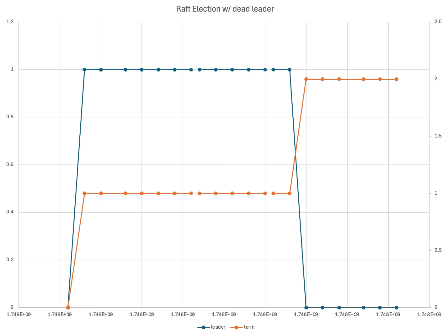 { "ownId": 0, "term": 1, "ownState": { "Follower": {} }, "votedFor": 1, "lastElectionEpoch": 1747601543035, "lastHeartbeatEpoch": 1747601559492, "currentLeader": 0}We can kill the leader and watch another election. Here, I just plotted the term and selected leader over tine: